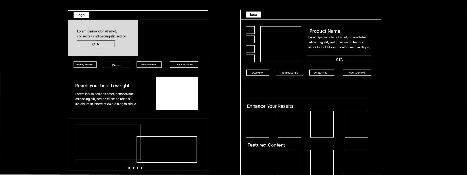 The wireframes prioritize user needs and Herbalife’s branding, laying the groundwork for a design that enhances usability and promotes user engagement. Objective is to Welcome users with an intuitive layout showcasing the brand's mission, products, and key features. Provide detailed, accessible product information to support informed purchasing decisions.